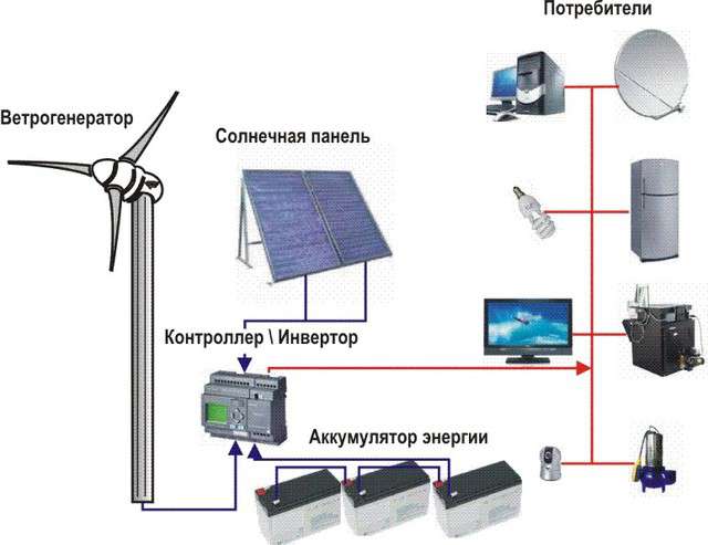 Основа системы-ветрогенератор, дополнительным компонентом идут солнечные панели.